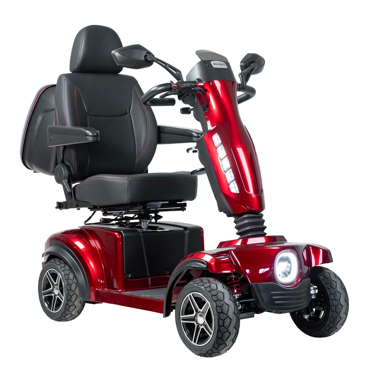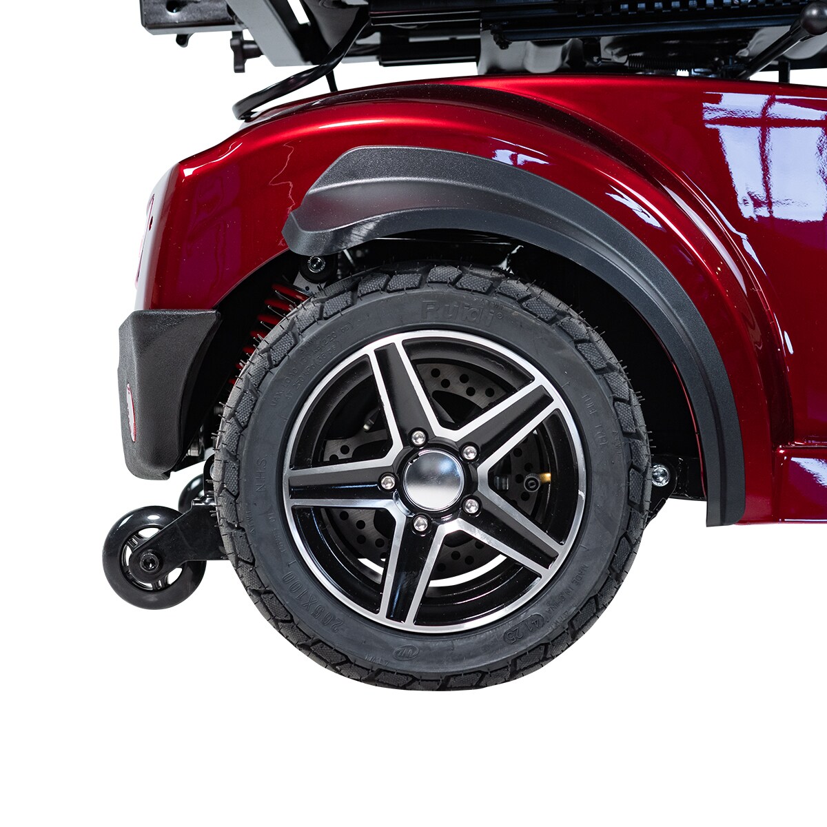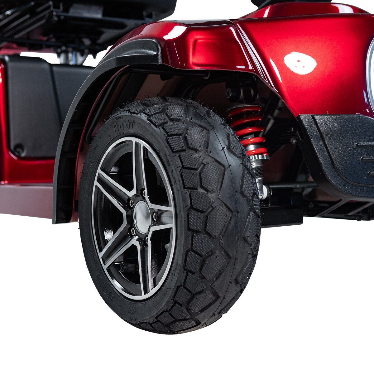 Affjedring for og bag samt luftfyldte dæk giver en blød og stabil køreoplevelse – også på ujævnt underlag. Med to hastighedsniveauer og trinløs hastighedsregulering kan du nemt tilpasse farten efter omgivelserne.