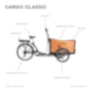EvoBike Cargo Classic er en klassisk designet ladcykel, men opleves som slank og lethåndterlig på trods af sin store lastkapacitet. Batteriet er skjult under en af siddebænkene i ladet, hvilket yderligere forstærker det slanke design. Cargo Classic har sortlakeret stel og detaljer i børstet aluminium og læder, hvilket giver ladcyklen et luksuriøst look. Cargo Classic har ekstraforstærkede dobbeltbundne alufælge og eger i rustfrit stål.